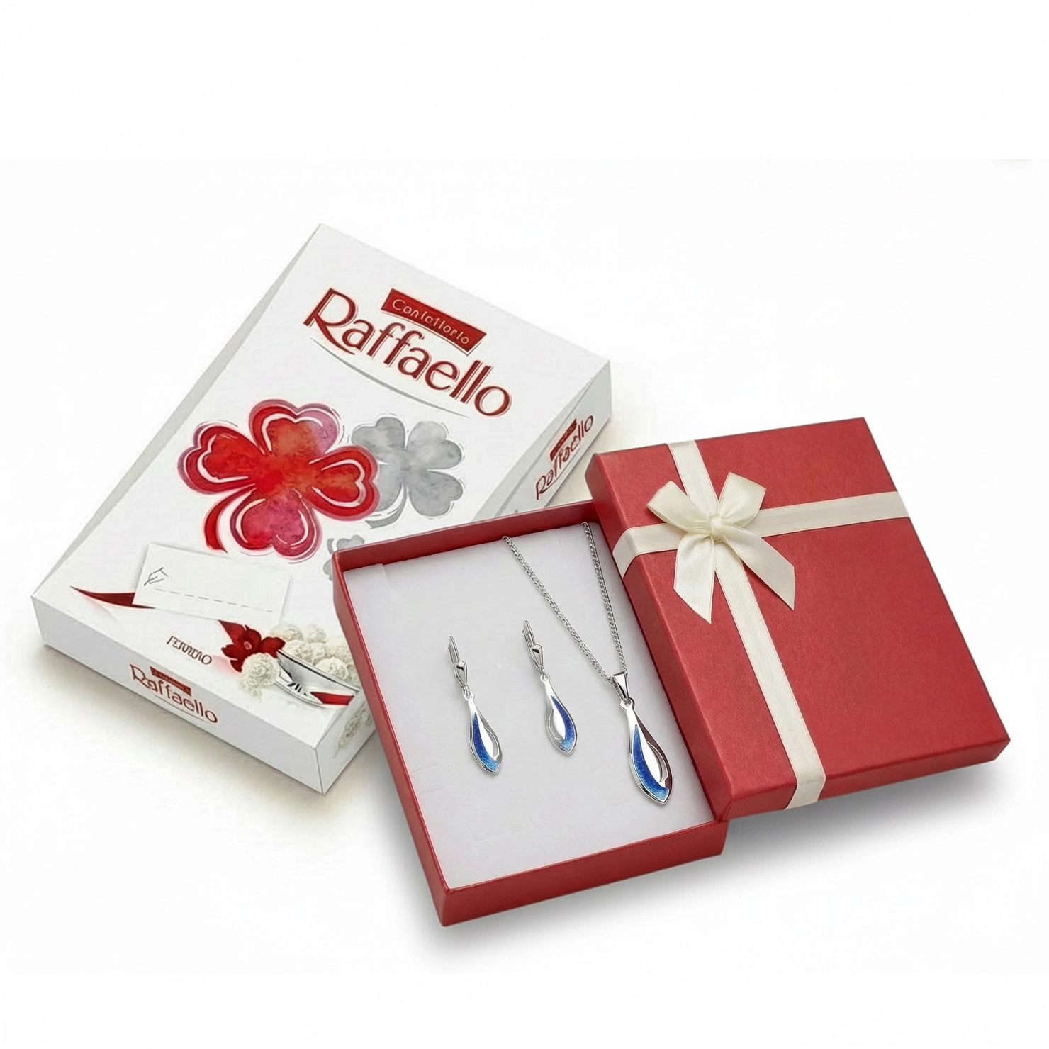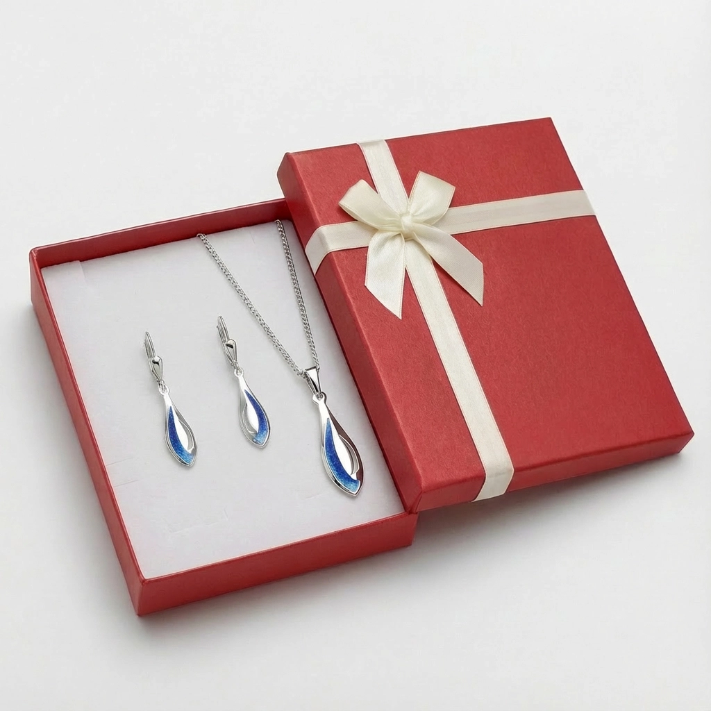 Dárková sada stříbrných šperků s motivem kapky s modrým třpytivým dekorem obsahuje přívěsek na řetízku a náušnice. Všechny šperky jsou vyrobeny ze stříbra 925/1000 a krásně k sobě ladí. Sada je uložena v elegantní červené krabičce s mašlí – ideální jako dárek k Vánocům, Valentýnu, narozeninám, výročí nebo svátku a nebo prostě jen tak.