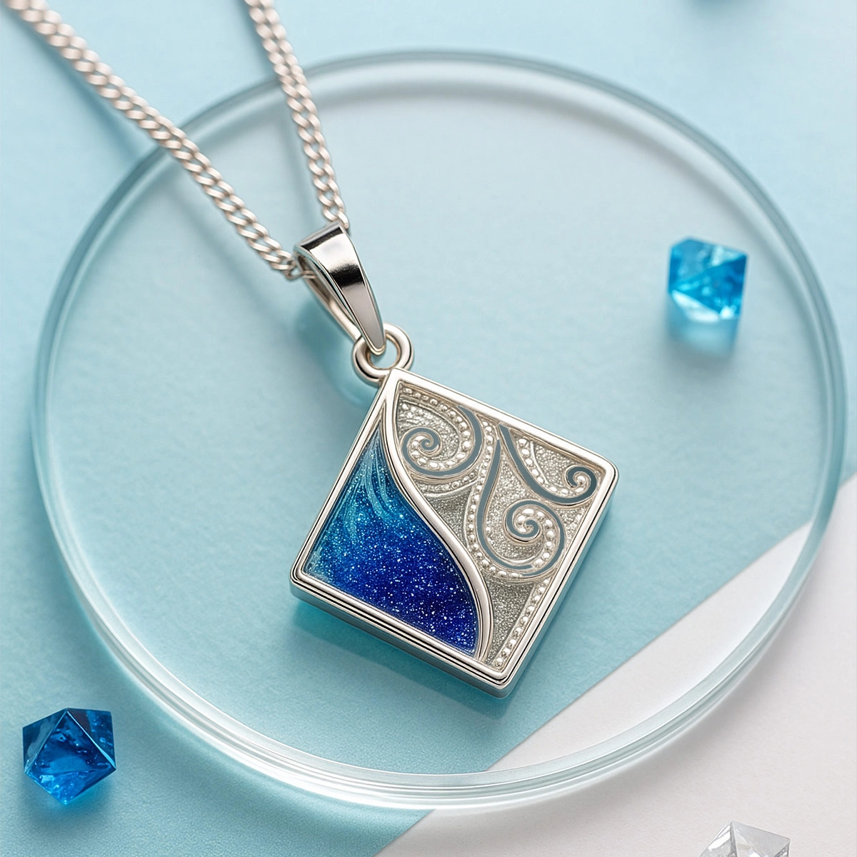 Elegantní stříbrný přívěsek ve tvaru čtverce s originálním zdobením KO5194_CU035_45. Jedna polovina je vyplněna modrým dekorem s jemným třpytivým efektem připomínajícím mořské vlny, druhá polovina zdobena ornamentálním vzorem ve stříbře. Vyroben z kvalitního stříbra 925/1000, ideální pro ženy, které hledají moderní a výrazný šperk s jedinečným stylem.